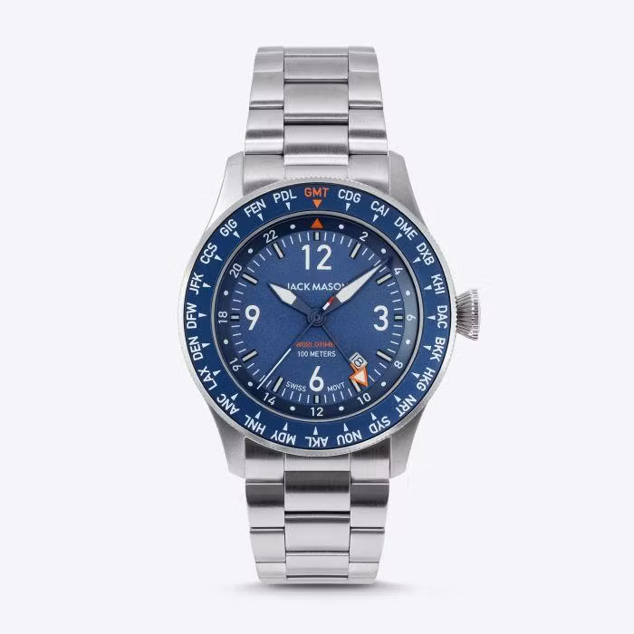 Although Chicago dominates the UTC – 6 time zone, Mexico City has a strong showing. And Dallas-based Jack Mason introduces some variety with the Dallas – Fort Worth (DFW) airport code on its great quartz caller Pursuit World Timer.
