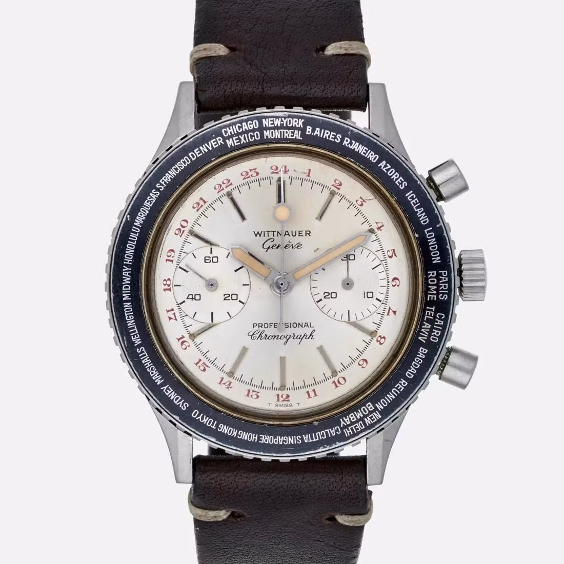 The Wittnauer 7004B World Time Chronograph (a rare combination) and others replace the otherwise standard Los Angeles with San Francisco. Two French language world timers, Invencible and Wittnauer WT Rotating Bezel include Vancouver with Los Angeles. Both Momentum and Halios are based in Vancouver and have GMT watches but haven’t produced a world timer yet, but might possibly do so with their home city in UTC – 8 position. One can hope…
